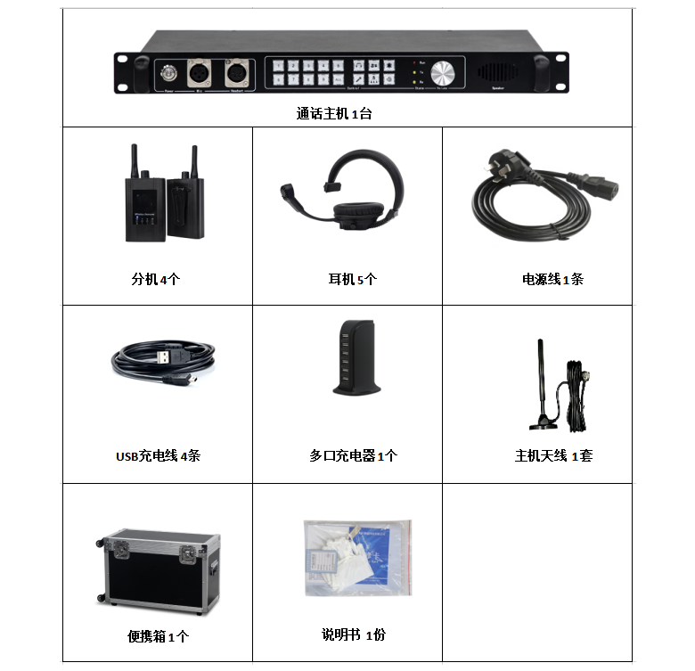 1.通話主機采用1U標準機架式設(shè)計,配備揚聲器、音量控制旋鈕、4Pin XLR頭戴耳機口、3Pin XLR麥克接口、DB 25Pin Tally輸入接口、ANT收發(fā)天線接口、AUX音頻輸入輸出和220V電源接口,主機可上機架安裝。