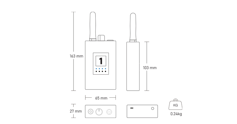 天線接口SMA-K母頭 開關(guān)及音量旋鈕 6芯mini XLR耳機接口 3.5寸LED顯示屏 狀態(tài)指示燈 分機設(shè)置按鍵 mini usb充電口 3.5 Tally輸出口 背夾 |