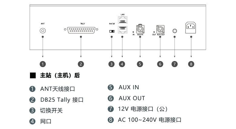 | 按鍵接口 | 電源開(kāi)關(guān) 水晶控制鍵16個(gè) 音量旋鈕 狀態(tài)指示燈 3芯XLR母座鵝頸麥輸入 4芯XLR母座耳機(jī)輸出 揚(yáng)聲器 天線接口 (ANT母座) DB25母座Tally接口 3芯AUX IN音頻輸入 3芯AUX OUT音頻輸出 交流品型電源座AC輸入 |