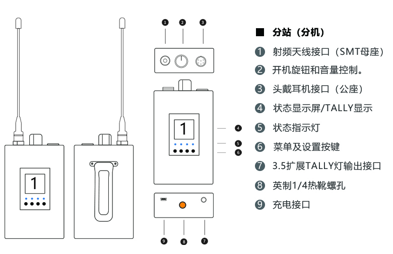 天線接口SMA-K母頭 開(kāi)關(guān)及音量旋鈕 6芯mini XLR耳機(jī)接口 3.5寸LED顯示屏 狀態(tài)指示燈 分機(jī)設(shè)置按鍵 mini usb充電口 3.5 Tally輸出口 背夾 支持:熱靴連接。 |