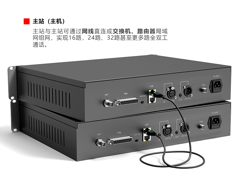 ★主站支持耳機(jī)、麥克風(fēng)、AUX輸入輸出,RJ45或路由器組網(wǎng)級(jí)聯(lián)等多種模式,以應(yīng)對(duì)多種多樣的導(dǎo)播活動(dòng)需求。