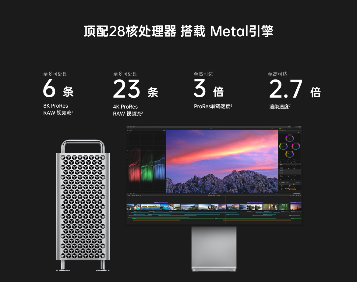 注:上圖所述性能展示,須搭載蘋果主機28核心處理器,1.5T ECC內存,2x32G圖形處理器,8T固態、Afterburner 加速卡及Final Cut Pro 新款軟件,具體需求,可聯系我公司。
