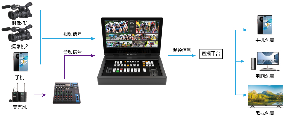 天影視通TCAST MAX便攜直播一體機采用純硬件嵌入式ARM架構設計,配有17.3寸監看屏幕,整機高度<2U,輕薄便攜,整體系統集成了包括視頻采集、音頻采集、導播切換、視頻錄像、網絡直播、IP拉流、音頻調音、畫中畫、字幕、臺標等功能于一體,廣泛應用于教育直播、校園電視臺、直播帶貨、會議直播、現場直播等。